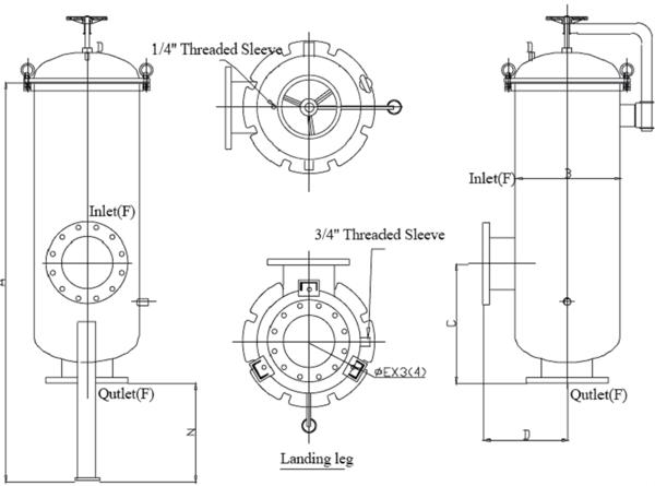 型號(hào) | 濾芯數(shù)量 | A | B | C | D | E | F | N | 流量(m3/h) |