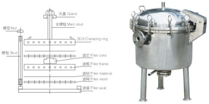 該機(jī)過濾的濾網(wǎng)采用Ocr18Ni9材料,并用濾布或?yàn)V紙作為過濾介質(zhì),使液體由各濾層小孔中流過,而將懸浮在液體中的固體粒子留在介質(zhì)上