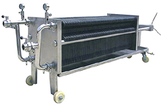懸浮液用料泵送入濾機(jī)每個(gè)密閉的濾室,在壓力作用下,濾液透過(guò)濾層及濾布、經(jīng)濾布出液口排出,濾渣則留在濾框內(nèi)形成濾餅,從而達(dá)到固液分離的目的。